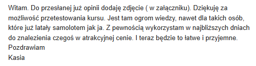 Po ukończeniu Waszego kursu wiem, że największe marzenie mojej córki o locie samolotem chyba wreszcie się spełni.