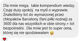 MONIKA PO OBEJRZENIU KURSU: Ten kurs jest tak wyjątkowy! Miałam wrażenie, że siedzę przy stole z najlepszymi przyjaciółmi. W końcu ktoś poprowadził mnie za rękę, krok po kroku. Kiedy udało mi się znaleźć atrakcyjny cenowo lot do Hiszpanii, moje serce zabiło mocniej, oczy rozbłysły a z twarzy nie schodził uśmiech. Poczułam ogromną radość, ekscytację ale i ulgę, że w końcu wiem jak to zrobić! Wiem na co zwrócić uwagę, żeby nie mieć później kłopotów czy nieprzyjemności.