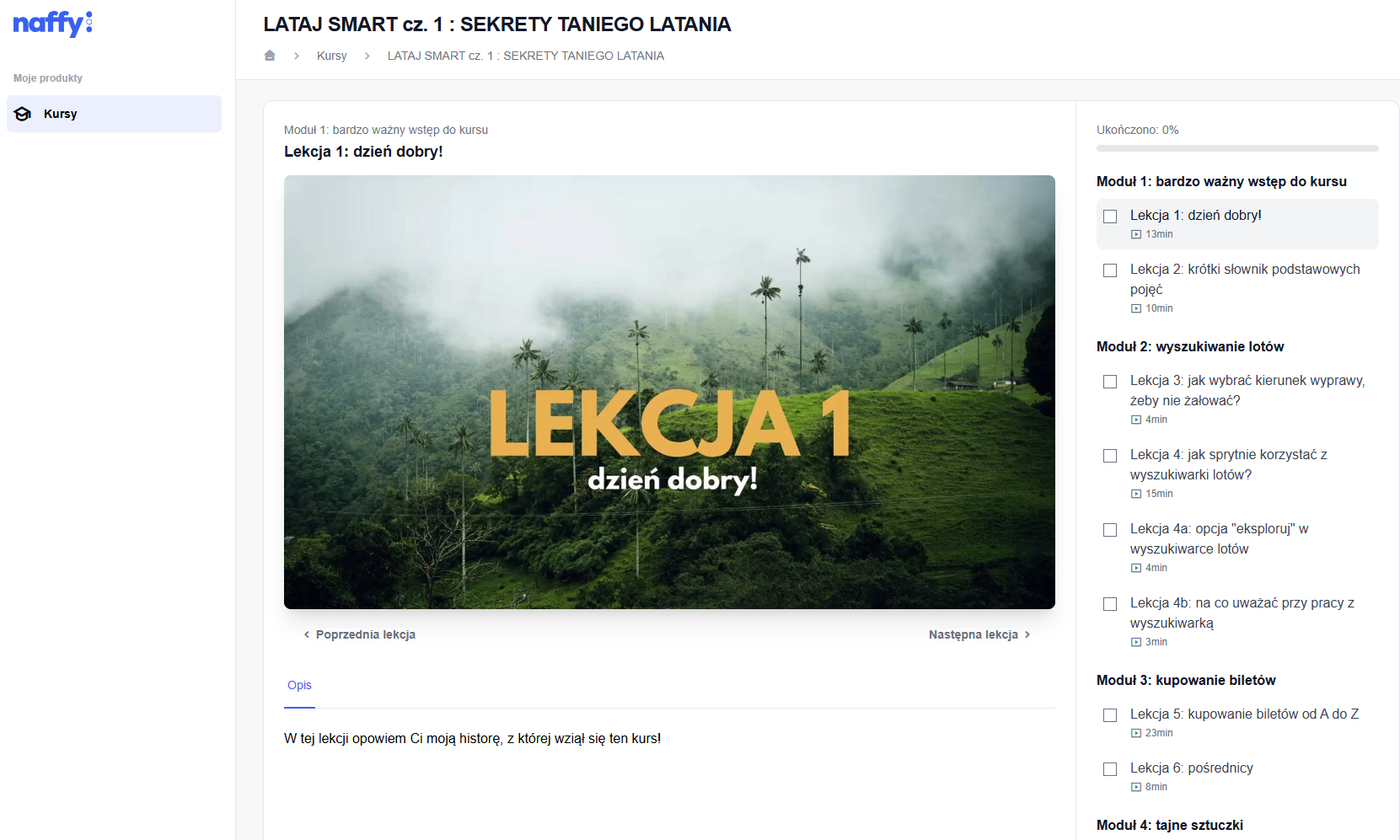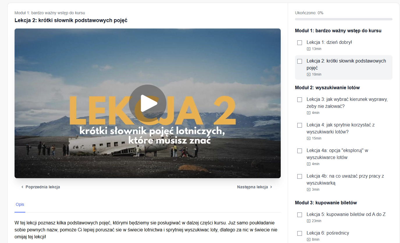 "LATAJ SMART: SEKRETY TANIEGO LATANIA" | Moduł 1: bardzo ważny wstęp do kursuLekcja 1: dzień dobry! Lekcja 2: krótki słownik podstawowych pojęć Moduł 2: wyszukiwanie lotówLekcja 3: jak wybrać kierunek wyprawy, żeby nie żałować? Lekcja 4: jak sprytnie korzystać z wyszukiwarki lotów? Lekcja 4a: opcja "eksploruj w wyszukiwarce lotów Lekcja 4b: na co uważać przy pracy z wyszukiwarką Lekcja 4c: najczęstsze rady jakie znajdziesz w sieci Moduł 3: kupowanie biletówLekcja 5: kupowanie biletów od A do Z Lekcja 6: pośrednicy Moduł 4: tajne sztuczkiLekcje 7a-7d omawiają 4 najlepsze sposoby na szukanie tanich biletów (tytułów teraz nie ujawnię, żeby nie oddawać wiedzy za darmo!). Zapewniam, że działają i aktualnie to one pozwalają nam wyszukiwać najlepsze okazje. Moduł 5: tanie linieLekcja 8: optymalizacja zakupów biletów w tanich liniach Moduł 6: na zakończenieLekcja 9: podsumowanie Lekcja 9a: prośba do Ciebie |