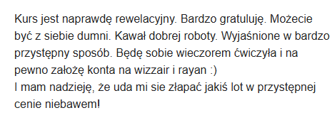 Twój kurs jest podany w prostej, zrozumiałej dla każdego formie. Wszystko jest wytłumaczone krok po kroku i od razu można zacząć samodzielnie szukać tanich lotów (i to skutecznie). Czuję radość i wiarę w to, że nareszcie polecimy całą rodziną gdzieś poza Europę!