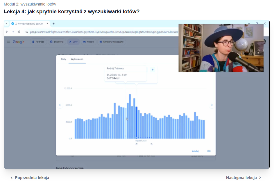 "LATAJ SMART: SEKRETY TANIEGO LATANIA" etap 2 | Ogarniamy wyszukiwarkę lotówTłumaczę Ci wszystko krok po kroku, bo dobrze zadane pytanie to klucz do uzyskania dobrych wyników. Uczysz się także całego procesu kupowania biletów, żeby dobra cena nagle nie "podskoczyła". |